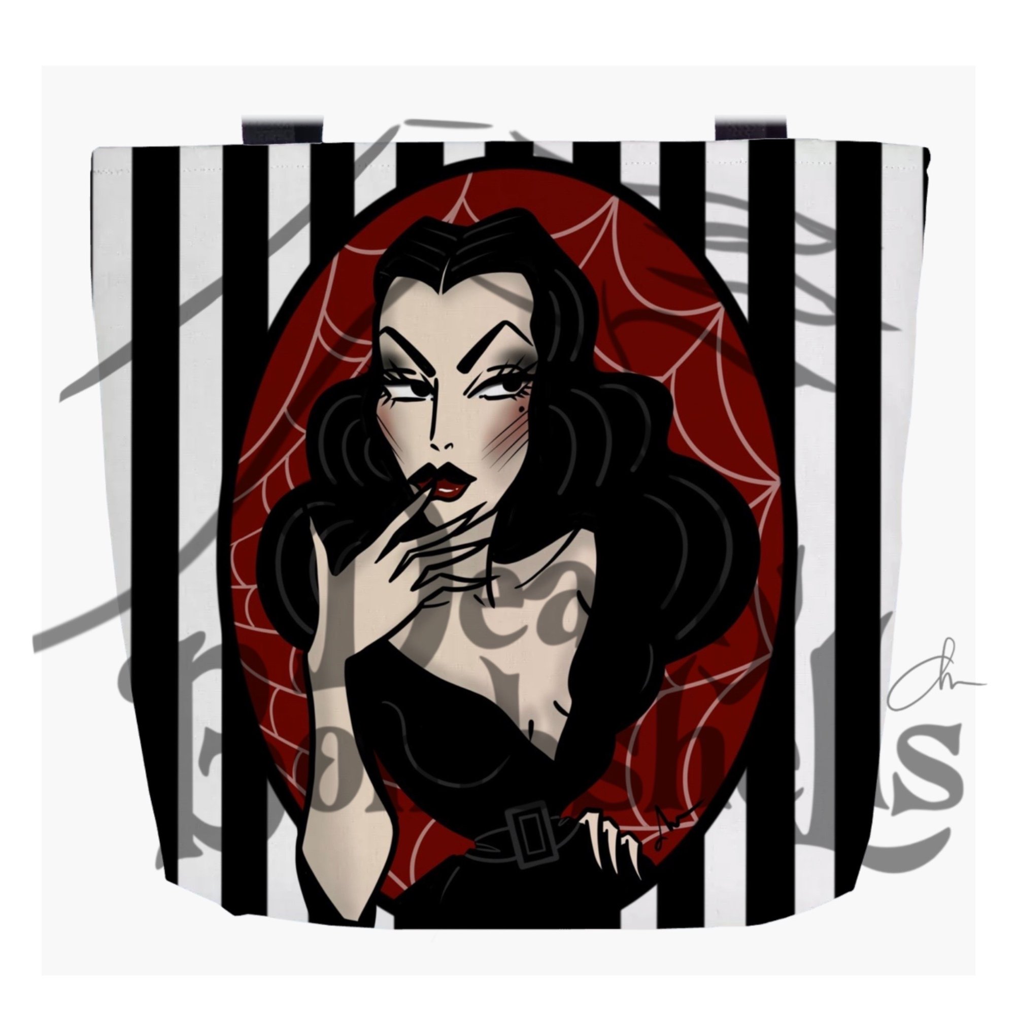Vampira Original Illustration Printed on 16" x 16" Premium durable spun polyester tote bag with traditional straps. ( same image is printed on both sides).
